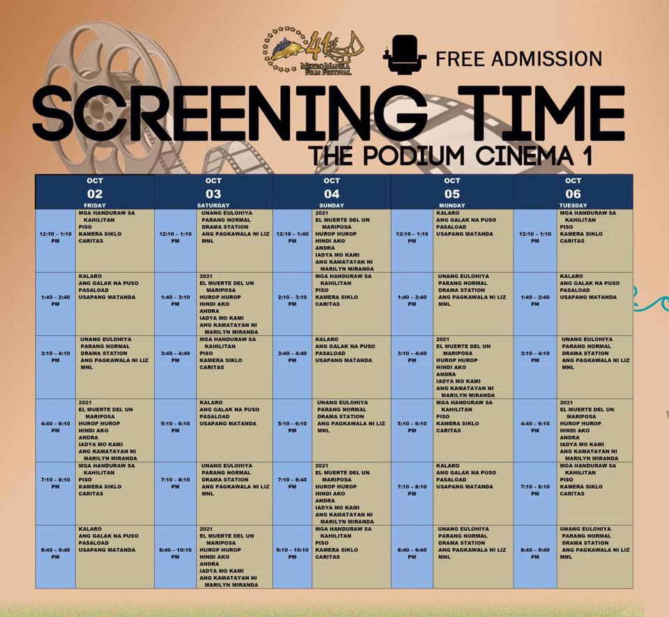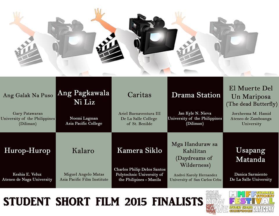 Metro Manila Film Festival (MMFF) Summer Student Film Festival 2015 will run from October 2 to 6, 2015 at Cinema 1, The Podium Mall, Mandaluyong City. Admission is free on a first-come, first-served basis.