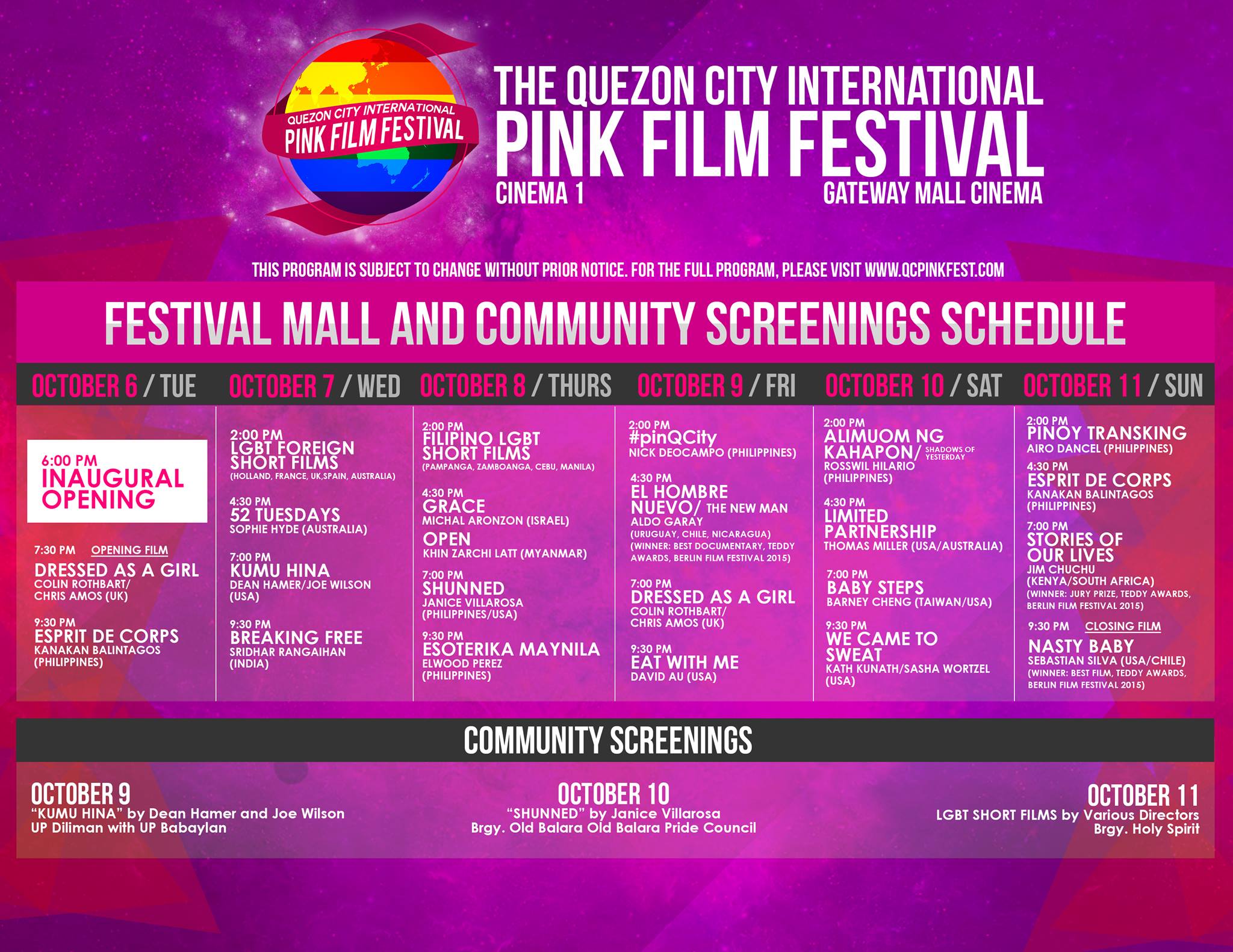 The following is the festival screening schedule of QC International Pink Film Festival 2015: