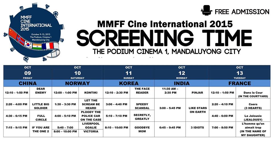 Metro Manila Film Festival (MMFF) Cine International 2015 will run from October 9 to 13, 2015 at Cinema 1 of The Podium Mall, ADB Avenue, Ortigas Center, Mandaluyong City. Admission is free on a first-come, first-served basis.