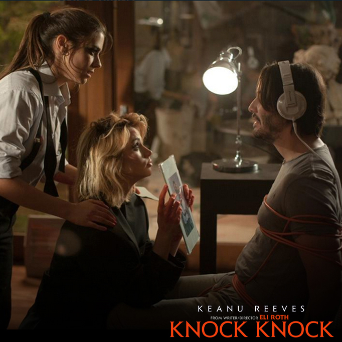 Keanu Reeves plays a devoted husband and father turned cheater for a night in the provocative sexy adult thriller Knock Knock directed by breakout filmmaker Eli Roth whose previous work in “Cabin Fever” etched him a prominent space in the horror thriller genre.