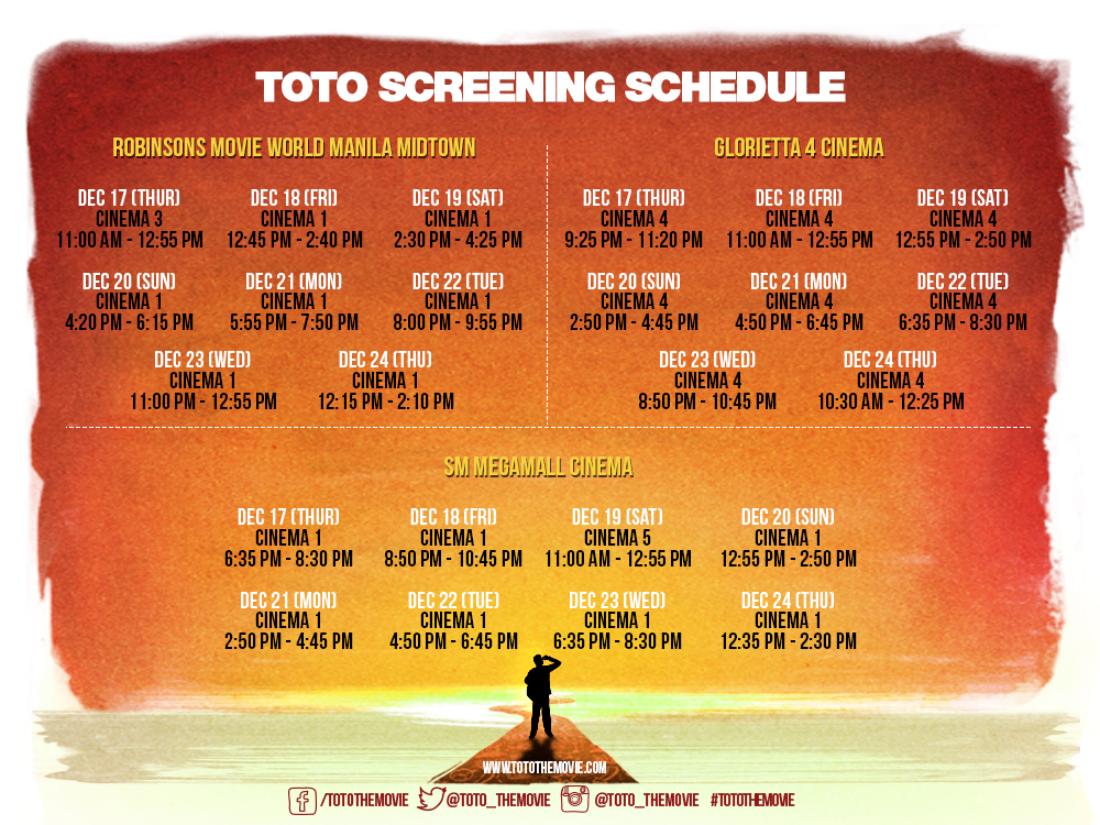 Toto is an official entry to the 2015 Metro Manila Film Festival – New Wave which will run from December 17 to 24 at SM Megamall, Glorietta 4, and Robinsons Place Manila.