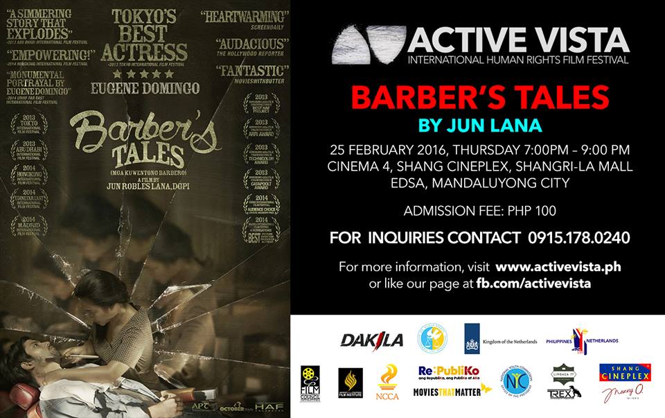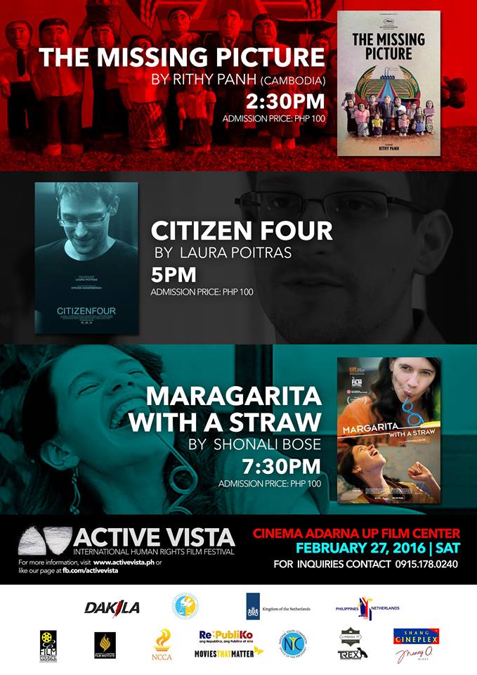 Active Vista Human Rights Film Festival 2016 will run from February 24 to 27 at key venues in Manila, Cebu, Davao, Dumaguete and Iloilo with the theme “Truth x Imagination,” in commemoration of the 30th Anniversary of the People Power Revolution, the culmination of the series of civil resistance against human rights abuses in the Martial Rule that led to the restoration of democracy in the Philippines.