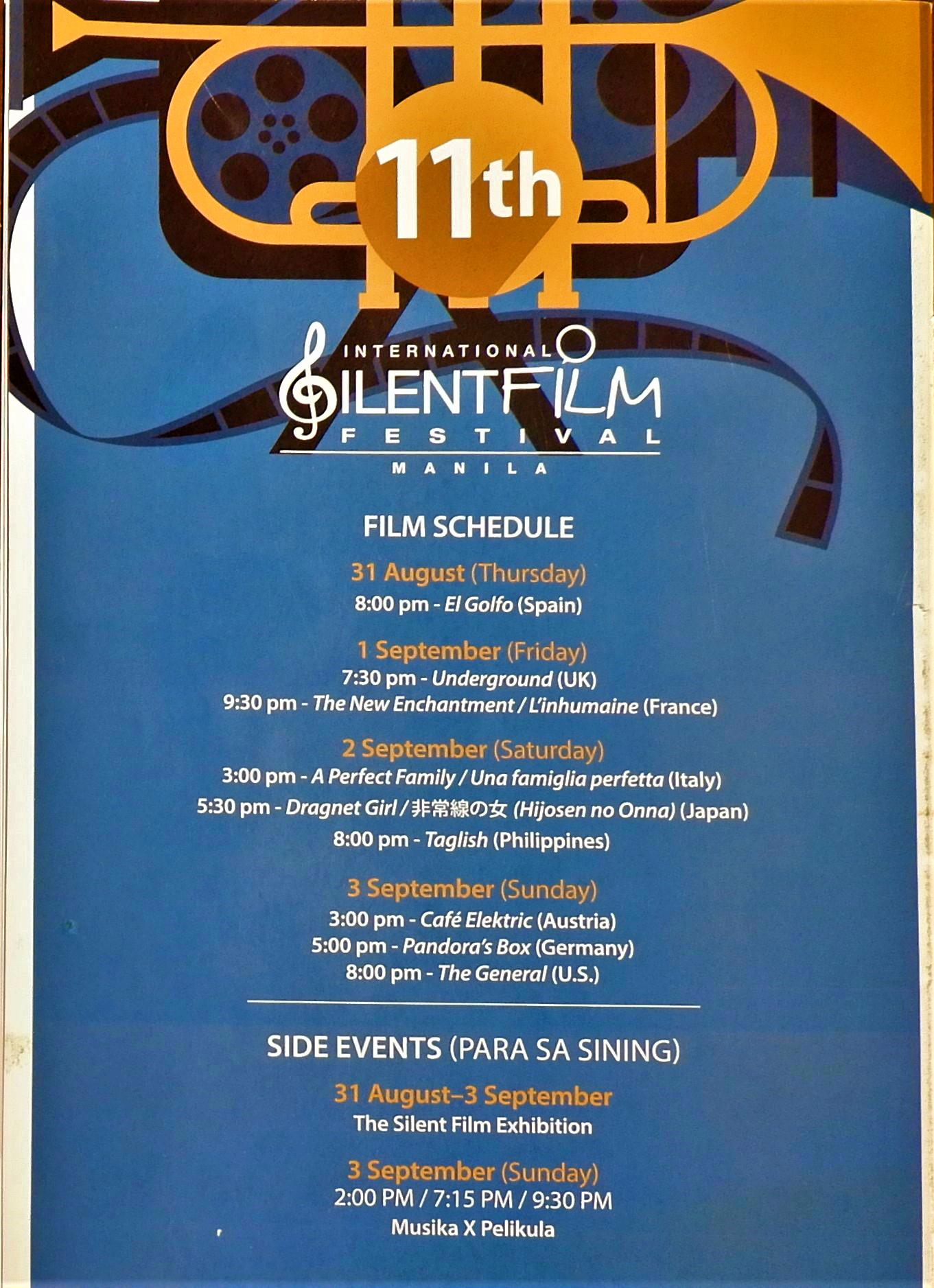 The 11th International Silent Film Festival Manila runs from August 31 to September 3 at the Shang Cineplex of Shangri-La Plaza Mall in Mandaluyong City.