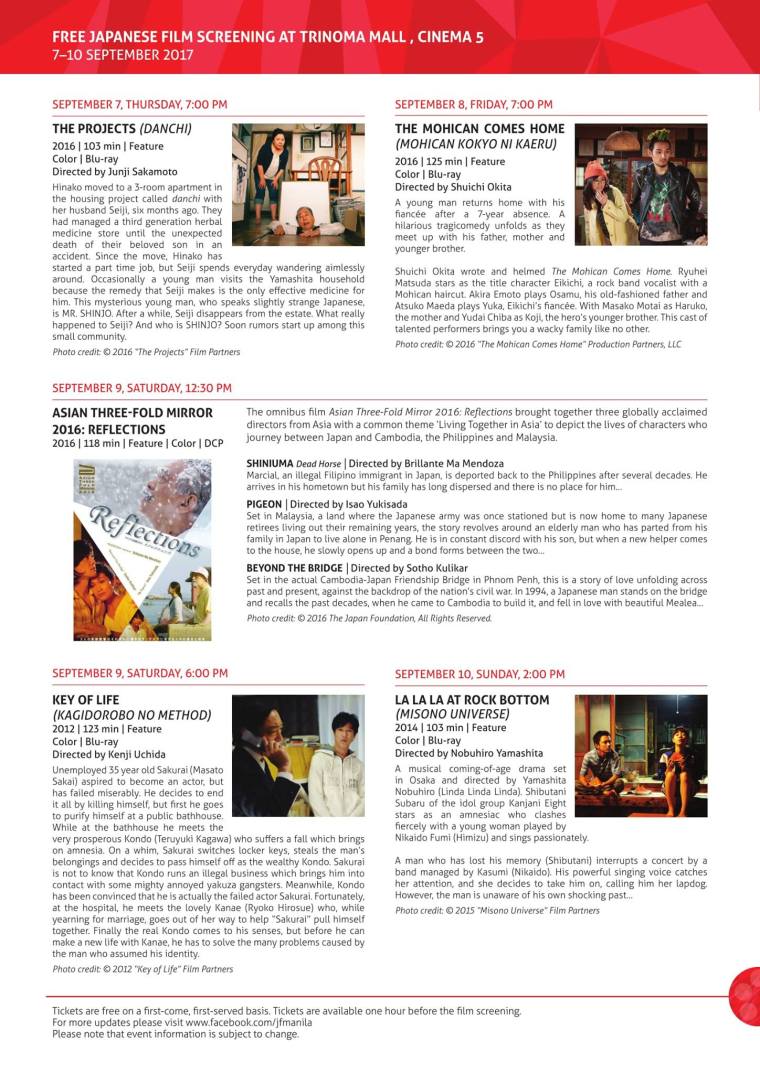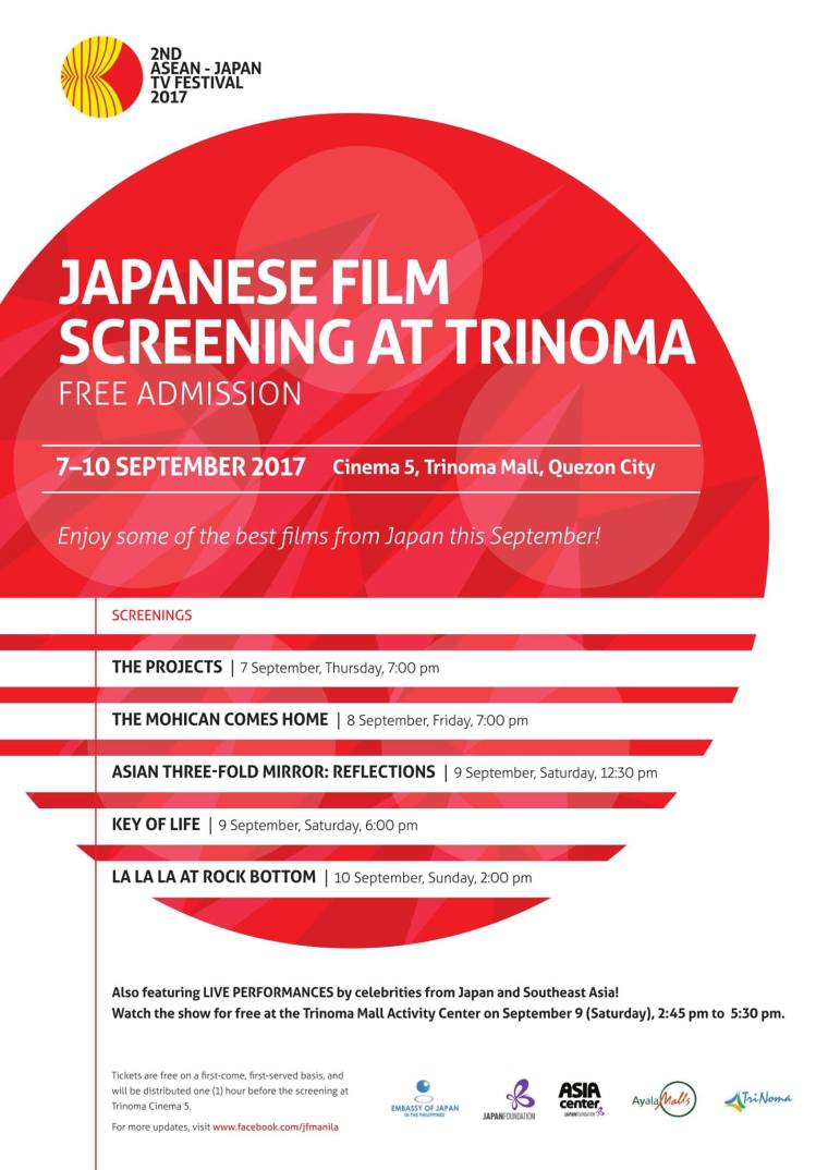 Free Japanese films will be screened on September 7–10 at Cinema 5, Trinoma Mall, Quezon City. This is presented by The Japan Foundation, Manila and The Embassy of Japan in the Philippines. This coincides with the 2nd ASEAN – Japan TV Festival 2017 (AJTVF2) in commemoration of the 50th Anniversary of ASEAN.
