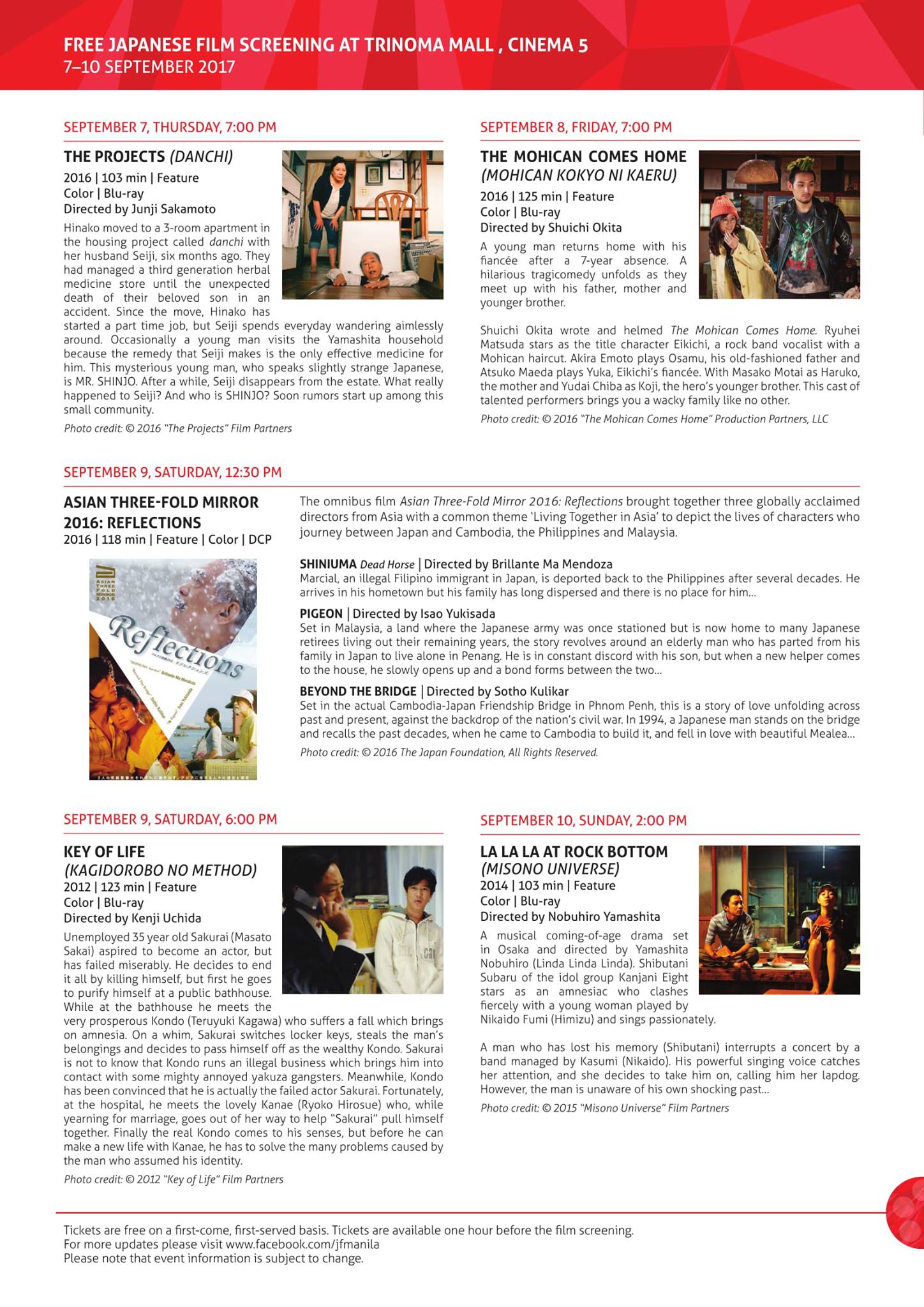 Admission is free on a first-come, first-served basis. Tickets will be distributed one (1) hour before each screening at Cinema 5 of Trinoma.