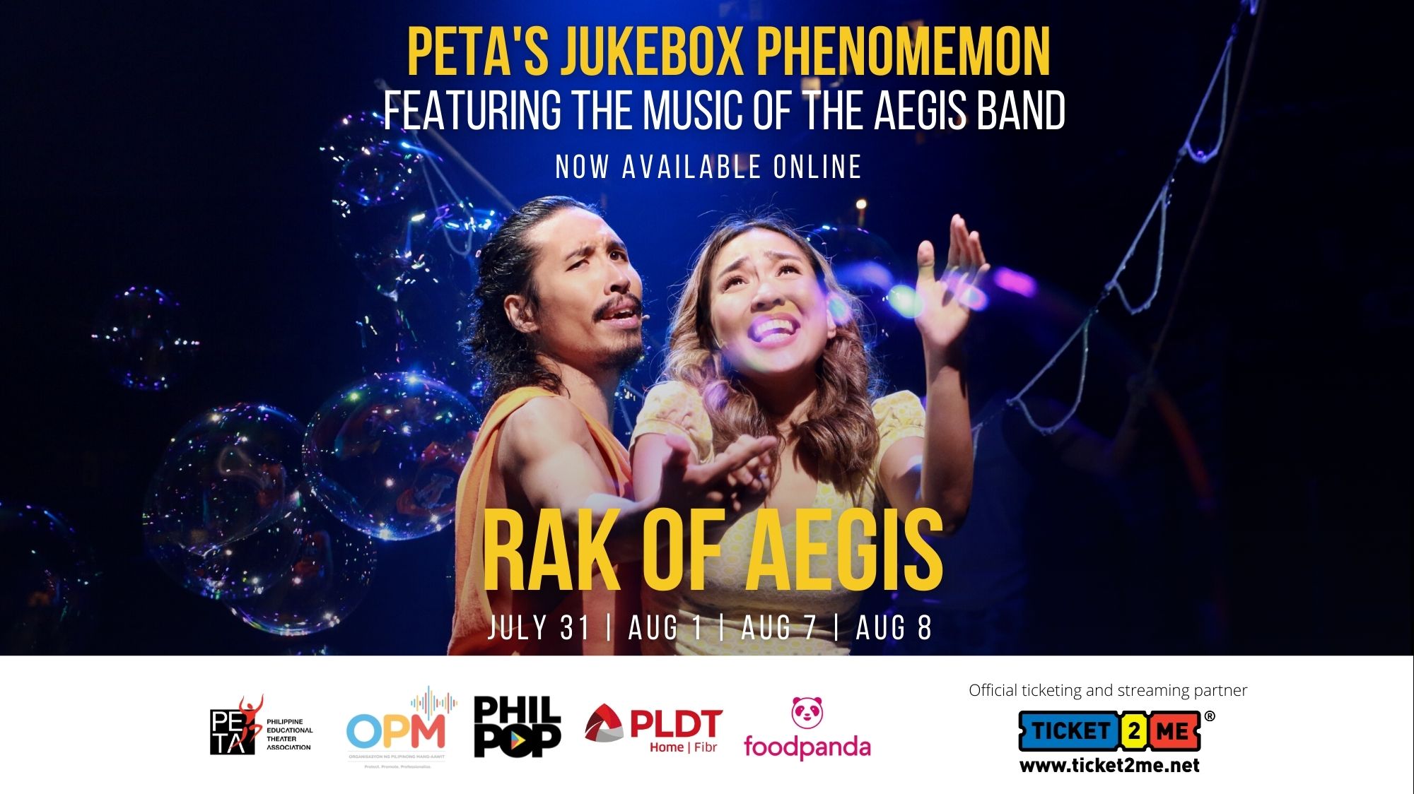 After insistent public demand, the Philippines’ longest-running original Filipino jukebox musical, Rak of Aegis, is going online! This is made possible by Philippine Educational Theater Association (PETA), together with Organisasyon ng Pilipinong Mang–Aawit (OPM), The Philpop Musicfest Foundation (Philpop), PLDT Home Fibr, and Foodpanda. Rak of Aegis will stream via www.ticket2me.net on the following playdates: July 31, August 1, August 7, August 8, 2021.