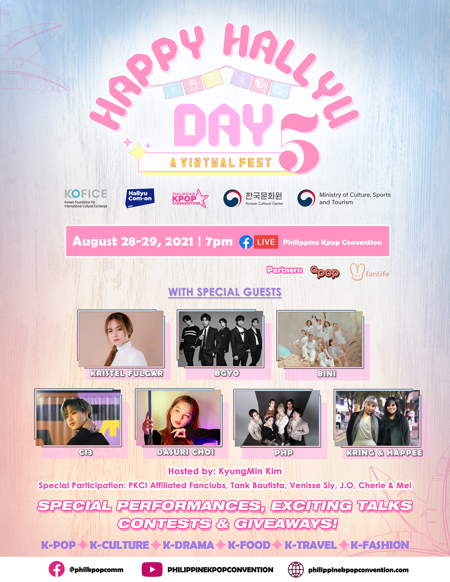 Happy Hallyu Day 5: A Virtual Fest is hosted by Philippine-based Korean host, KyungMin Kim, with opening performances by a multilingual soul-pop princess, Venisse Siy, and performer-producer, J.O. Presented by the Philippine Kpop Convention Inc., together with the Korean Cultural Center in the Philippines, Korea Foundation for International Culture Exchange (KOFICE), Hallyu Com-On, Ministry of Culture, Sports, and Tourism, and PKCI’s affiliated K-pop fan clubs, in partnership with Apop and Fanlife.