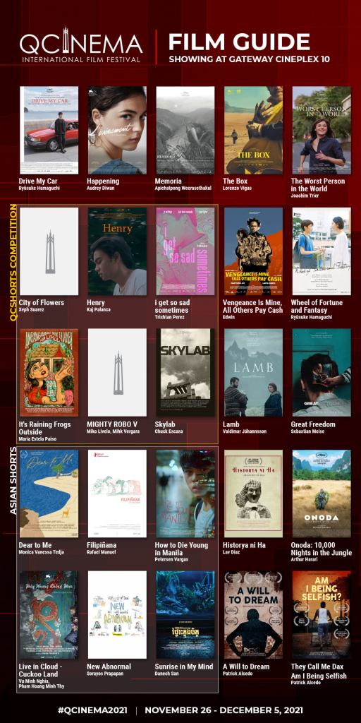 The films under Screen International, which is one of QCinema’s most awaited sections, are “The Worst Person in the World,” “The Box,” “Happening,” “Vengeance is Mine, All Others Pay Cash,” “Wheel of Fortune and Fantasy,” and “Drive My Car.”
