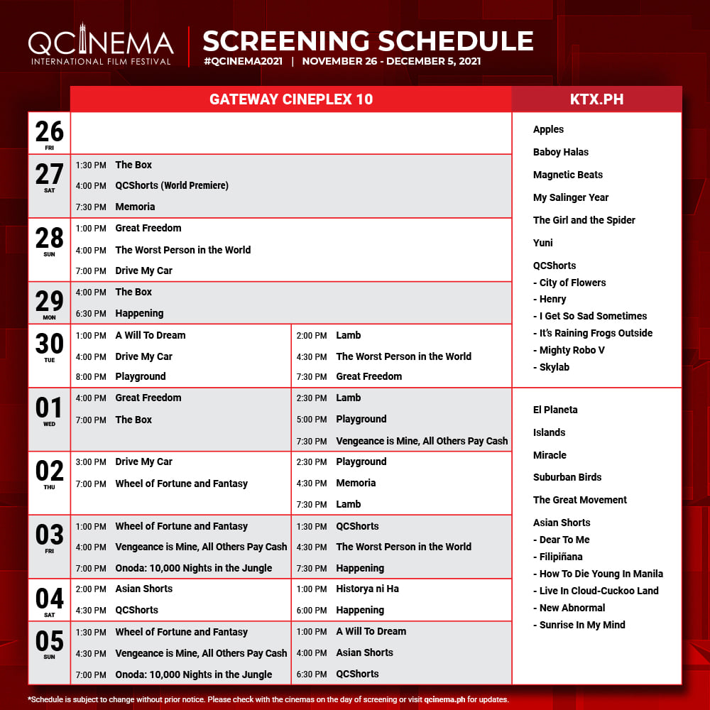 Check out the complete screening schedules of QCinema for its Gateway screenings and KTX streaming.