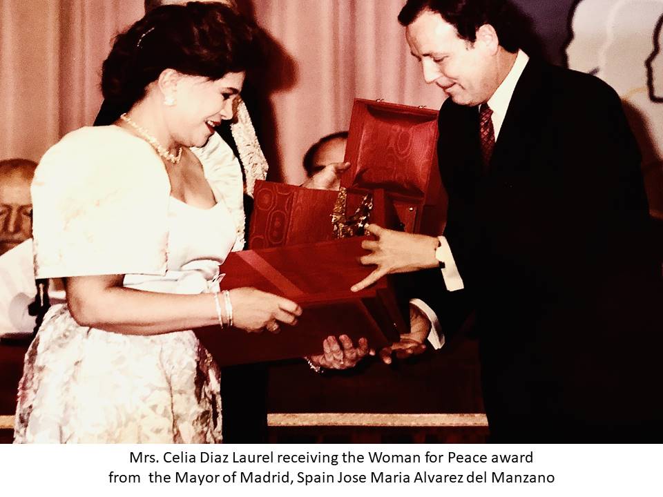 Alongside these many international engagements, she likewise organized and established several key socio – civic organizations like Causa Philippines, Inc., (a humanitarian movement against international communism), DAYTOP Philippines (Drug Addicts Yield to Persuasion), Handog Lingap sa May Kapansanan (HALIKA), Philippine Tuberculosis Society, Kidney Transplant Association, Gifted Children and Youth Foundation, Memorial to the Peaceful Revolution, Save the Children (Community Development), People’s Welfare Foundation, Philippine International Friendship Organization, Philippine General Hospital Foundation, Philippine National Red Cross Overseas and Diplomatic Divisions, and Peace Development Foundation, Inc. She also worked in the countryside where she focused on health and education developments like providing sustainable potable water in depressed areas and building public school libraries. Months before the big awarding ceremony in Madrid, Spain for the Woman for Peace, Mrs. Laurel tirelessly had already been providing relief to fellow Filipinos devastated by natural calamities (i.e. earthquakes, the eruption of Mt. Pinatubo, and the killer cyclone in Ormoc City) that hit our country in the early 90s.