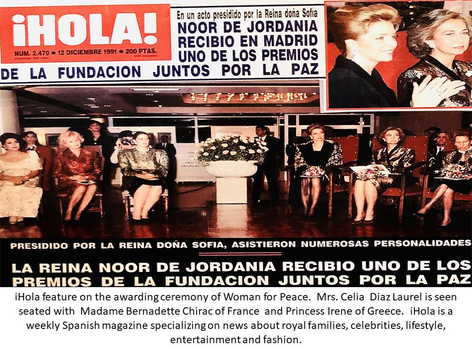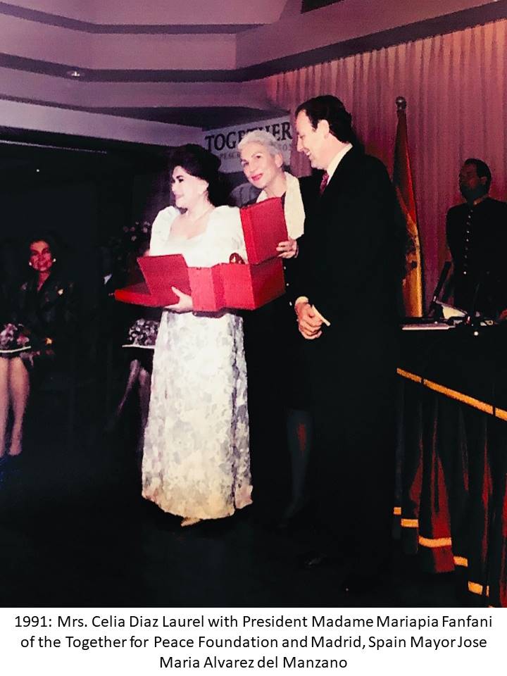 The grand awarding ceremony was held at Pabellon De Cecilio Rodriguez in Madrid, Spain on November 29, 1991. Besides Mrs. Laurel, other honorees that year were Queen Noor of Jordan, Madame Chirac of France, and Madame Silva of Portugal. The occasion had 400 guests in attendance –– comprising mostly of prominent international personalities like Senator Gianni Agnelli of Italy and royalties like Prince Saddrudin Aga Khan, King Simeon of Bulgary, and Baron and Baroness con Thiessen Bormenisza. With her conferment, she joined the revered roster of past awardees like Queen Sophia of Spain, Raissa Gorbachev, Former US First Ladies Nancy Reagan and Barbara Bush, Marcella Perez de Cuellar, Diana Vreeland, President Violeta Chamurro of Nicaragua, and Queen Sirikit of Thailand.