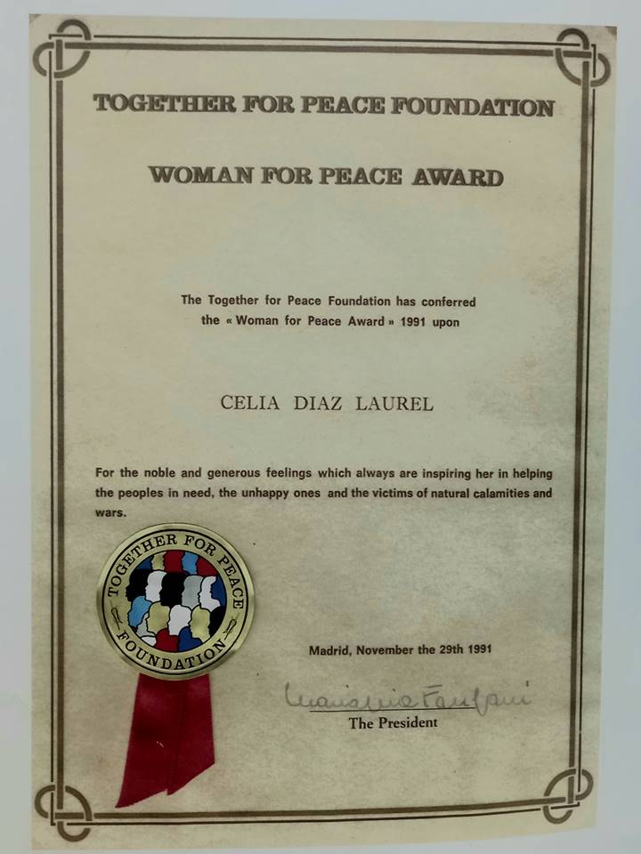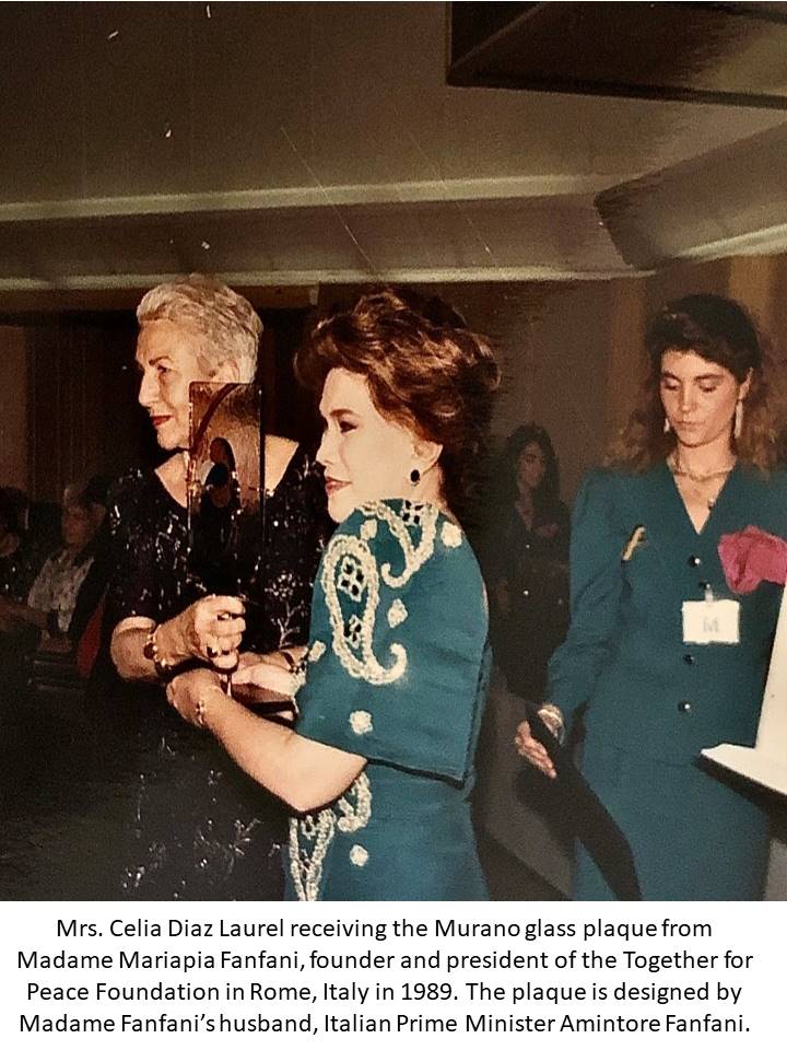 It’s the pearl anniversary of Mrs. Celia Diaz Laurel’s confernment of the highly prestigious international peace and humanitarian award ‘Woman for Peace’ given by the Insieme Per La Pace (Together for Peace) Foundation. The milestone event is happening on November 29, 2021.