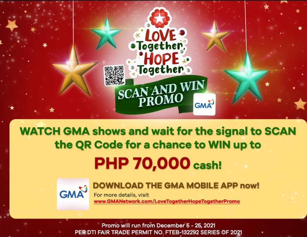 To join GMA’s ‘Love Together, Hope Together Scan and Win Promo,’ simply download for free the latest version of the GMA mobile application on your Android or iOS device via Google Play or Apple Store. You can win up to Php 70,000!