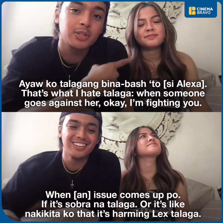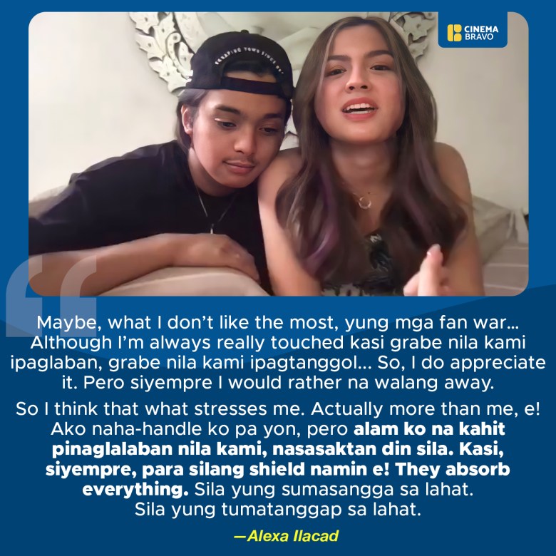 Alexa: “What I don’t like the most: yung mga fan war. Yung pag nag-aaway sila. Although… I’m always really touched kasi grabe nila kami ipaglaban, grabe nila kami ipagtanggol. Minsan naman talaga yung mga nang-aaway, yung mga basher, hindi ko alam kung may utak ba o wala—basta, parang gano’n!