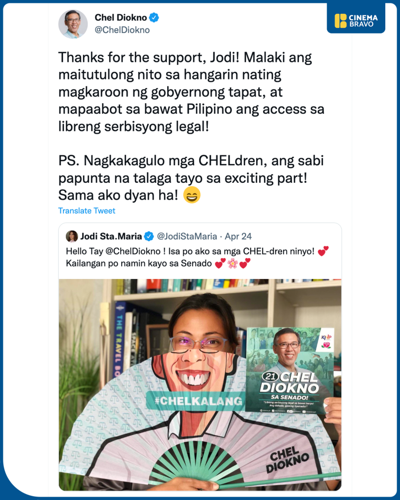She accompanied the post with the caption “Hello Tay @cheldiokno! Isa po ako sa mga Chel-dren niyo” and the hashtag #21cheldioknosasenado, referring to his number on the ballot.