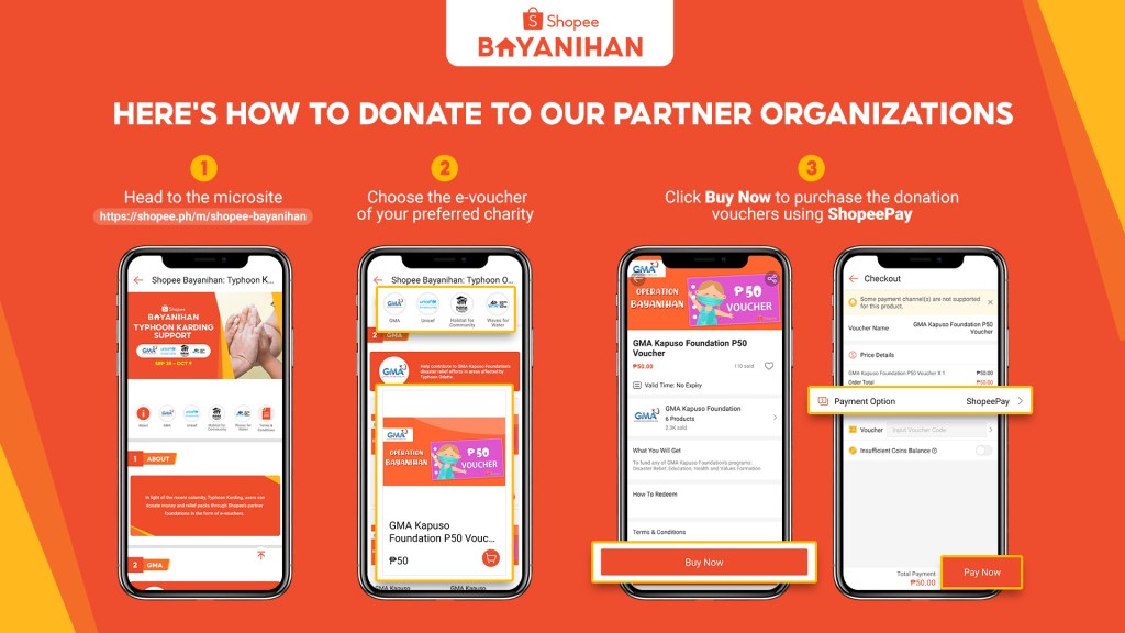 From September 28, 2022, to October 9, 2022, Shopee users can purchase the donation e-vouchers that will be used for water kits, health, and sanitation stations, and other essentials such as food and clothes from partner charities GMA Kapuso Foundation, Unicef, Habitat For Humanity, and Waves For Water. Users can view Typhoon Karding Support vouchers through https://shopee.ph/m/shopee-bayanihan and purchase them via Shopee’s integrated mobile wallet, ShopeePay.