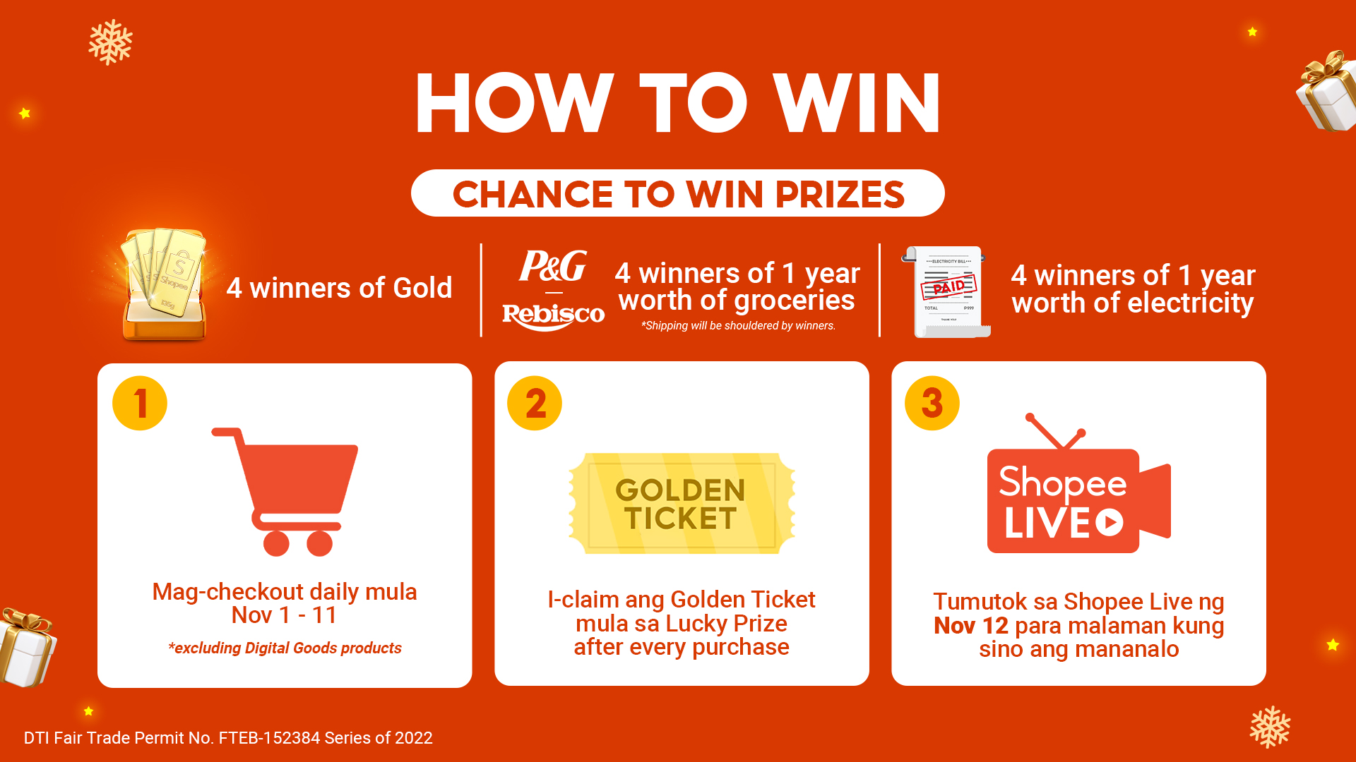 On November 12, stay tuned via Shopee Live to find out if you will be one of the 12 lucky winners to take home gold or a year-long supply of groceries or electricity!