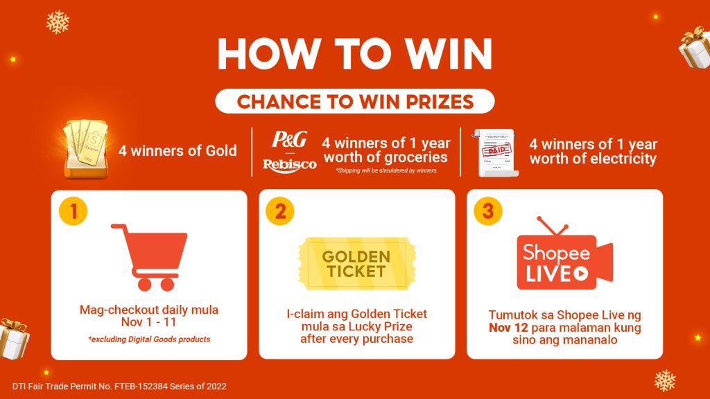 From today up to November 11, shoppers have the chance to take home a gold bar as the grand prize, or a year’s worth of groceries from Procter & Gamble and Rebisco, or subsidy for a year’s worth of electricity, and more. To join, just claim your Golden Ticket after every purchase and gain more chances of winning each time you shop on Shopee.