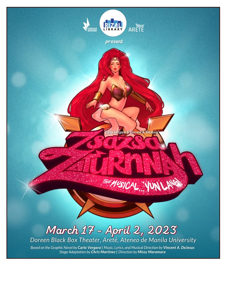 Presented by Rizal Library and co-presented by Areté Ateneo and Ateneo Blue Repertory, ZsaZsa Zaturnnah is based on the graphic novel by Carlo Vergara, adapted for stage by Chris Martinez, with music and lyrics/ musical direction by Vincent A. de Jesus. Directed by Missy Maramara.