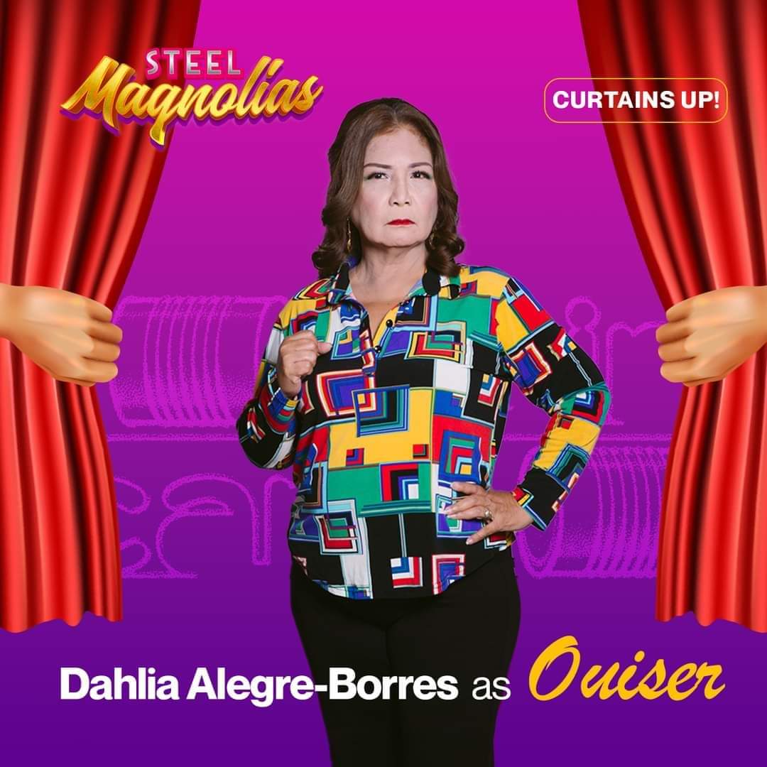 DAHLIA ALEGRE BORRES plays the role of Ouiser (pronounced as Weezer) Boudreaux. She’s both mature and childish; lovely, but miserable. A wealthy old bitty, whose sense of humor will shred you to bits.