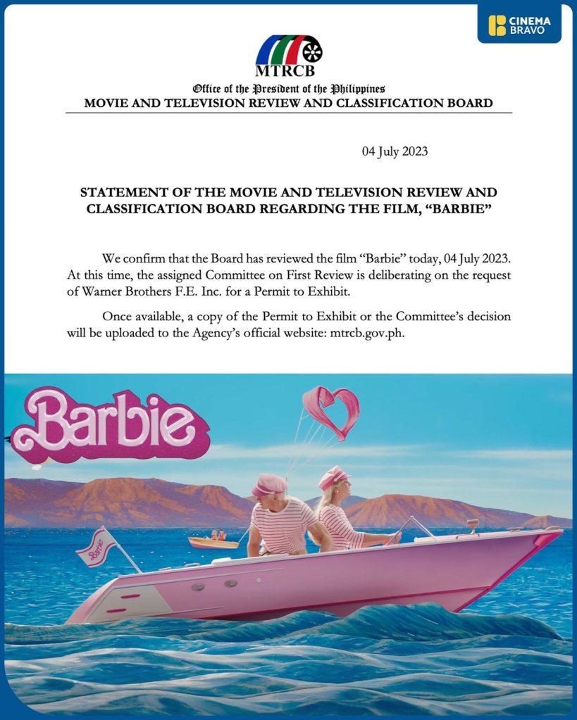 “We confirm that the Board has reviewed the film “Barbie” today, 04 July 2023. At this time, the assigned Committee on First Review is deliberating on the request of Warner Brothers F.E. Inc. for a Permit to Exhibit. “Once available, a copy of the Permit to Exhibit or the Committee’s decision will be uploaded to the Agency’s official website.”