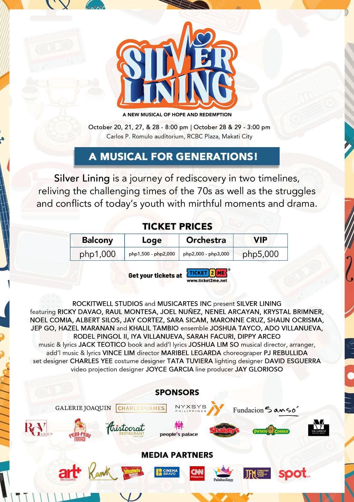 There’s a new original Filipino play to watch called ‘Silver Lining: A New Musical of Hope and Redemption.’ It runs on the weekends of October 20 to 22 and 27 to 29 at RCBC Plaza Theatre in Makati City, as presented by Rockitwell Studios and MusicArtes, Inc.