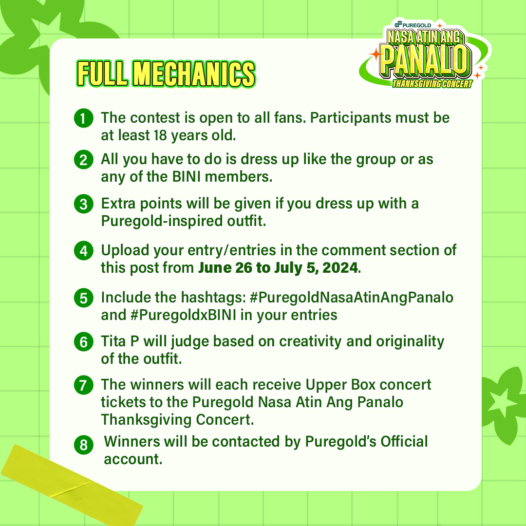 The contest is open to all fans aged 18 and above. Extra points will be awarded for Puregold-inspired outfits. Entries must be uploaded in the comments section of the official post on the BINI Facebook page any time from now until July 5. Hashtags #PuregoldNasaAtinAngPanalo and #PuregoldxBINI must be included in the entries, which will be judged on creativity and originality.