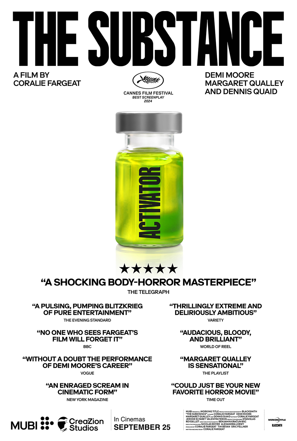 Prepare for a sensory overload with bold aesthetics, impeccable sound design, and eye-popping practical effects. The film offers a scathing look at the absurdity of beauty standards, featuring the iconic Demi Moore alongside rising star Margaret Qualley and veteran actor Dennis Quaid. With a key win at Cannes Film Festival as Best Screenplay and rave reviews, THE SUBSTANCE is set to captivate audiences and ignite intense anticipation.