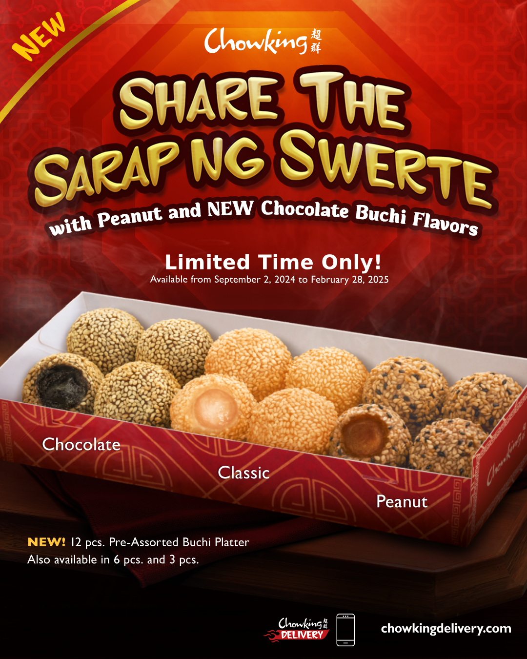 The Chowking Buchi Platter and Family Lauriat is available via dine-in, take-out, drive-through, or delivery via http://www.chowkingdelivery.com, the Chowking App, GrabFood, or foodpanda. Chocolate Buchi and Peanut Buchi limited-time flavors are available from September 2, 2024 to February 28, 2025 (or until supplies last).