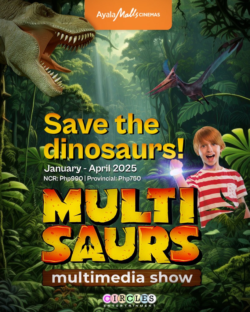 Having captivated families in over 200 cities across six countries in Europe and Asia, “Multisaurs” makes its Philippine debut as a 70-minute interactive show. It will be available exclusively in select Ayala Malls Cinemas: Manila Bay, Feliz, Circuit, Harbor Point, MarQuee, Ayala Center Cebu, Capitol Central, Centrio, Abreeza, Solenad, Trinoma with schedules at 10AM, 12:30PM, and 3PM. Check your nearest Ayala Malls for their respective skeds.