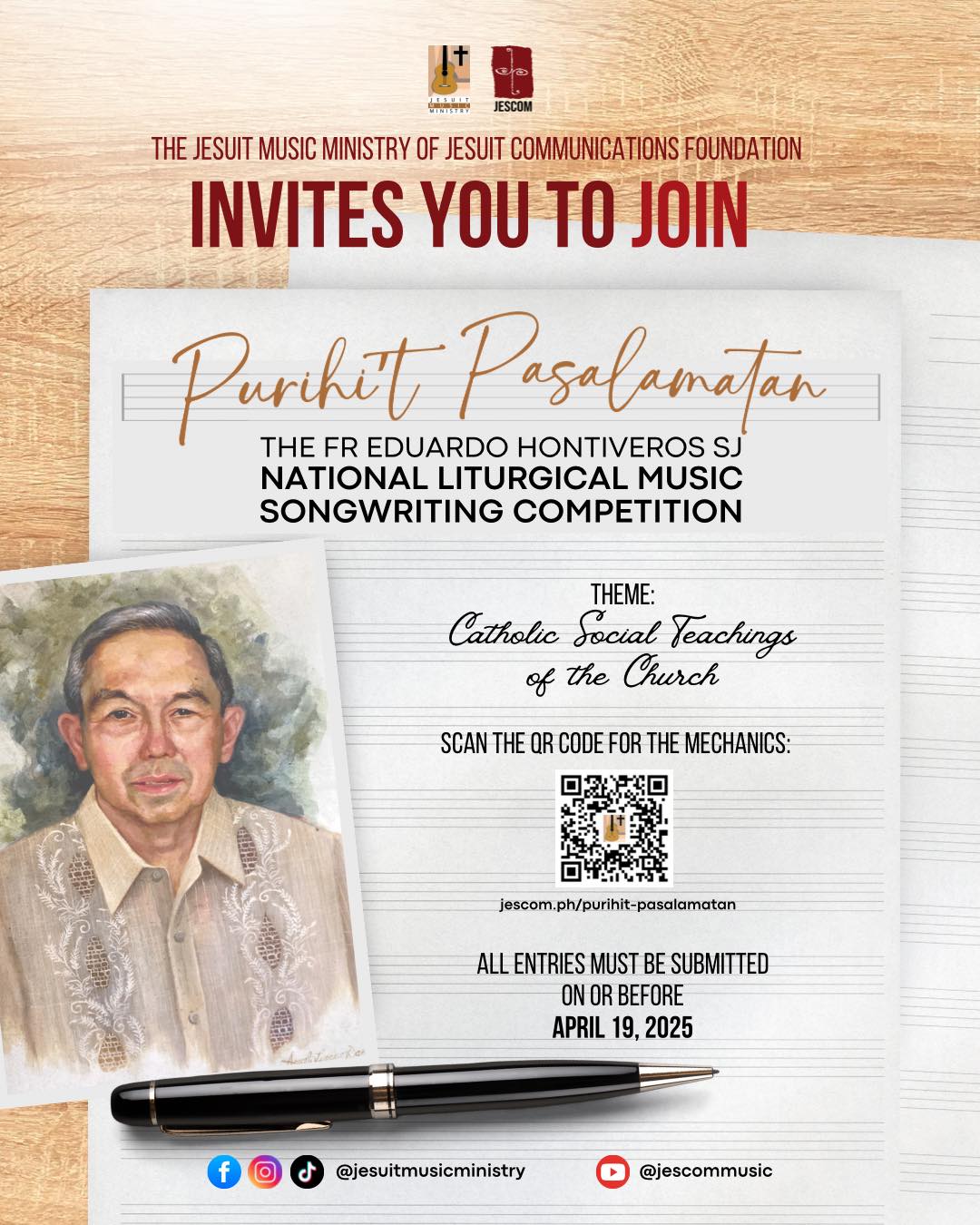 Continuing its mission to uphold and revitalize the rich tradition of Filipino liturgical music, the Jesuit Music Ministry (JMM) proudly introduces PURIHI’T PASALAMATAN: The Fr. Eduardo Hontiveros SJ Liturgical Music Songwriting Competition.