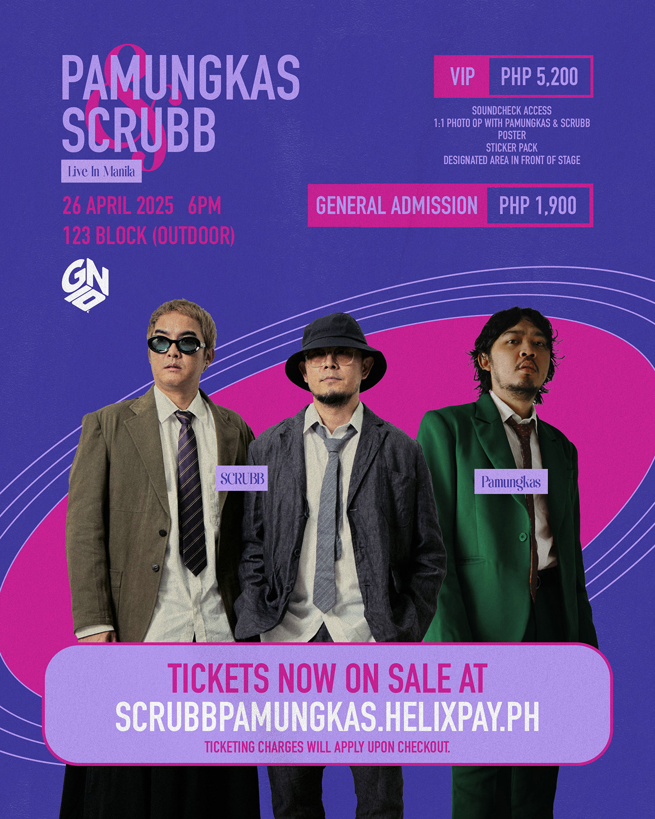 Tickets to #GNN10 Presents: Pamungkas and Scrubb Live in Manila are available on March 14, 2025, 12 noon via https://scrubbpamungkas.helixpay.ph.
