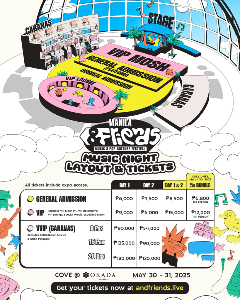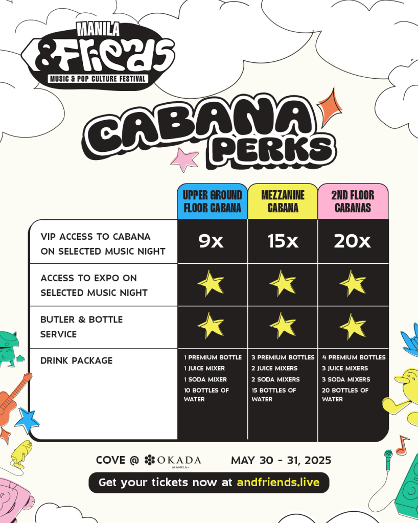The ultimate &FRIENDS experience can be enjoyed in VVIP Cabanas, starting at Php 54,000 for Day 2, for 9 pax. Day 1 cabanas are already sold out.