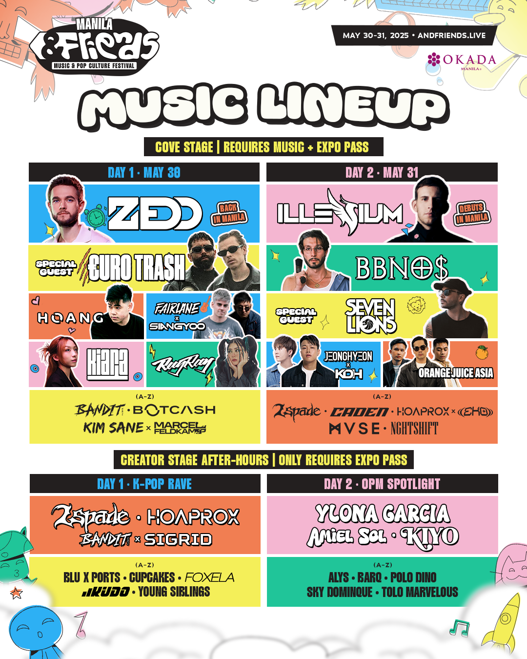 The highly anticipated &FRIENDS Festival boasts a powerhouse lineup headlined by Grammy-winning EDM superstar Zedd, who is set to return to Manila. Joining him for their first-ever performances in the Philippines are multi-platinum rapper bbno$ and Billboard Music Award winner for Top Dance/Electronic Album, ILLENIUM.