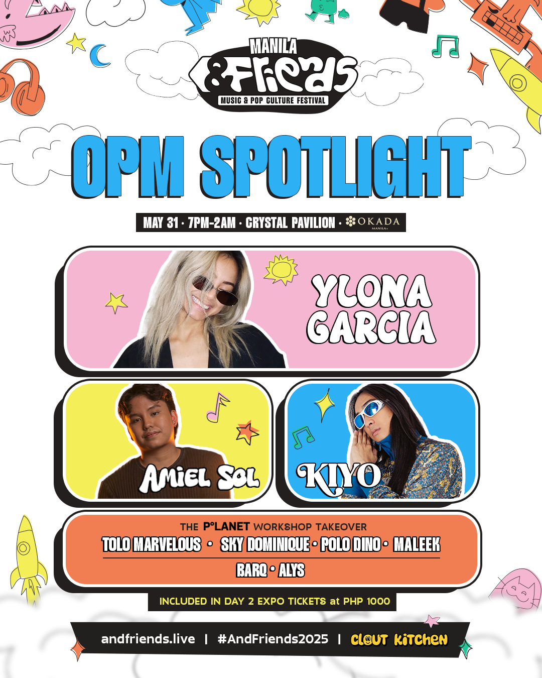 “Even though I moved to the USA, I still consider my music to be OPM. When the &FRIENDS team asked if I’d headline, I jumped at the opportunity to do so,” says Ylona Garcia. “I’m honored to be back in the country that I love and made me who I am today and I’m even more excited to be a part of a movement where we can all show that OPM can reach the world. Through thick and thin, I just hope to make the Philippines proud.”