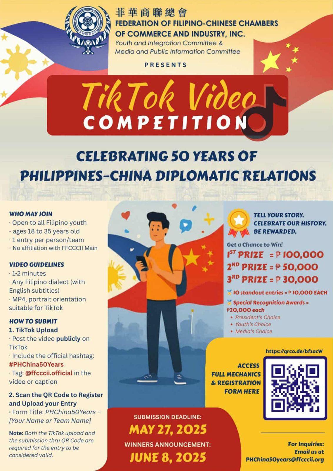 The Federation of Filipino Chinese Chambers of Commerce and Industry, Inc. (FFCCCII) has launched its “1–2 Minutes TikTok Video Competition” to mark the 50th anniversary of diplomatic relations between the Philippines and China.