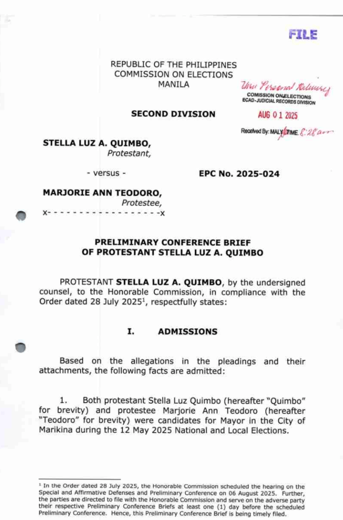 In her Aug. 8, 2025 memorandum, Quimbo alleged that the election was marred by malfunctioning and misreading of Automated Counting Machines (ACMs), blatant vote buying, and ballots from priority polling precincts that were not fed into the ACMs and counted.