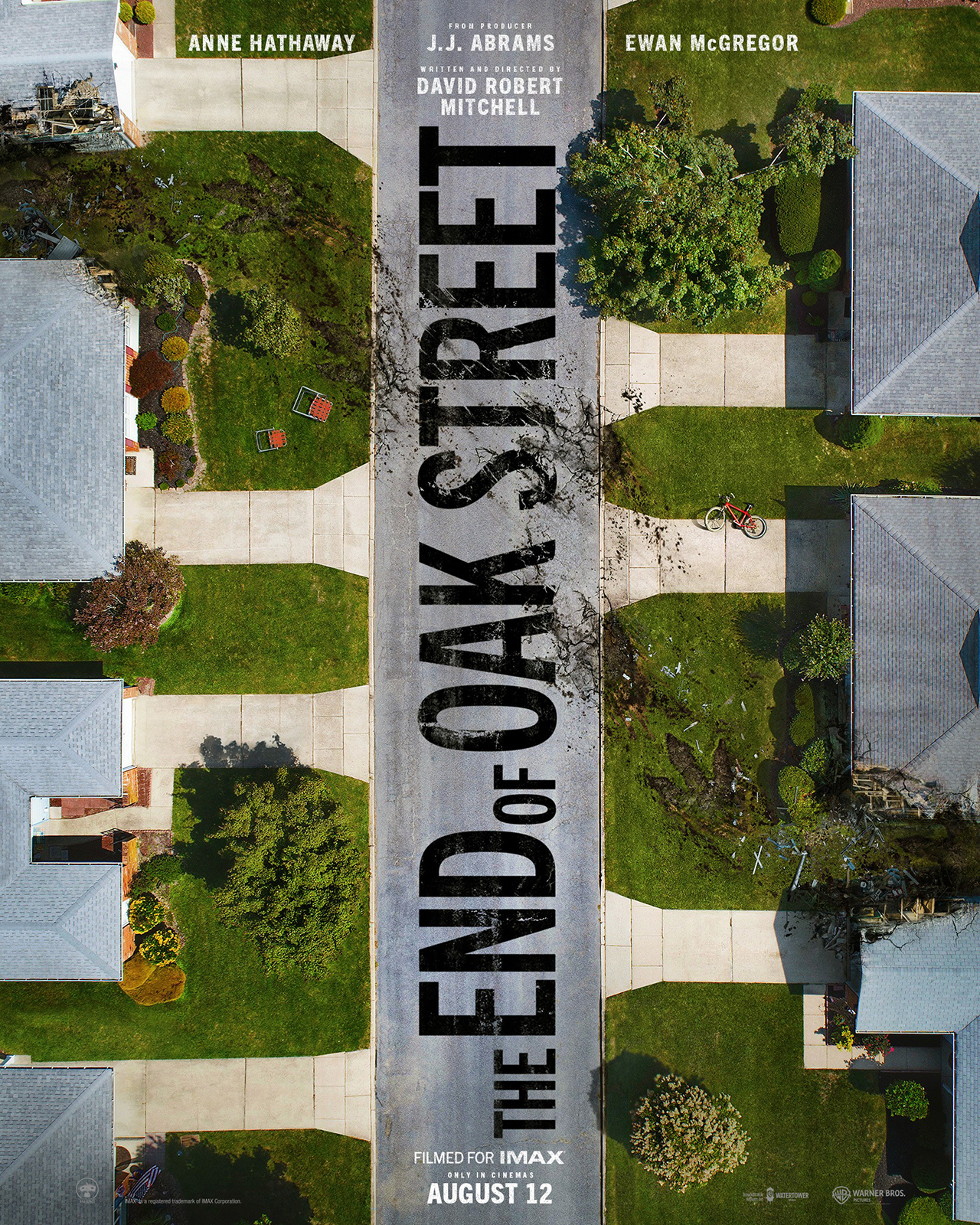 Warner Bros. Pictures Presents A Bad Robot Production, A Jackson Pictures Production, A David Robert Mitchell Film: THE END OF OAK STREET. The film will be distributed worldwide by Warner Bros. Pictures, only in theaters and IMAX in North America on August 14, 2026, and internationally beginning 12 August 2026.