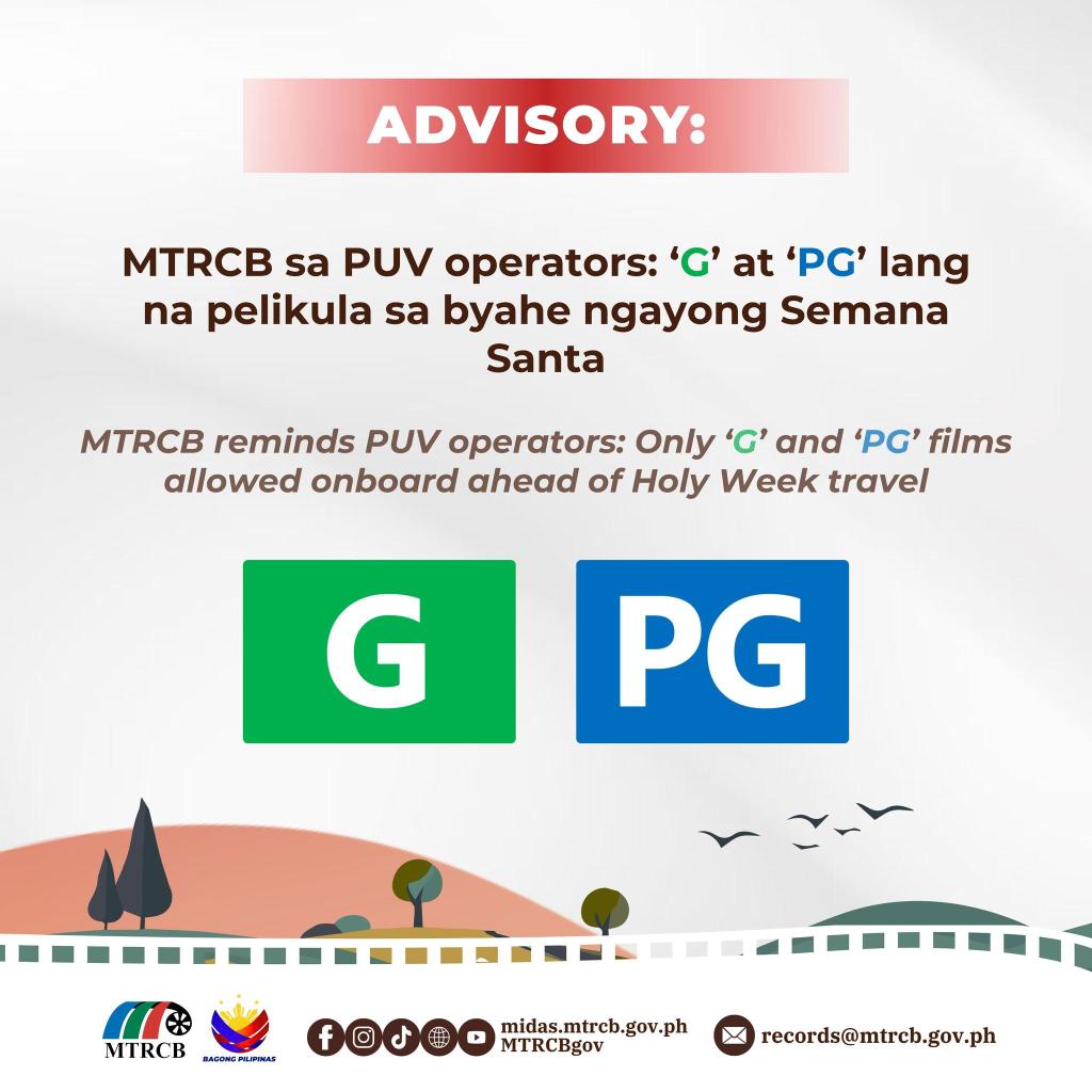 “By showing only ‘G’ and ‘PG’ content, operators help create a more respectful and family-friendly environment for everyone on board,” she added. Sotto said the reminder is part of the agency’s broader push for “Responsableng Panonood,” which promotes mindful and guided media consumption.